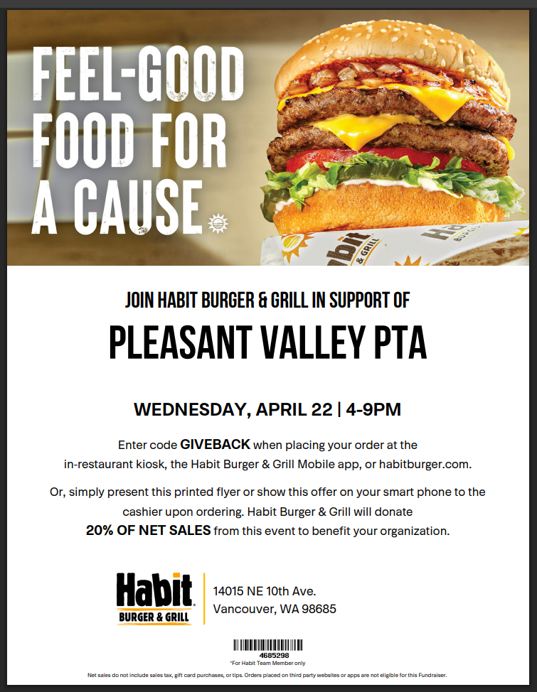 April 22nd - Habit Burger fundraiser 4-9 pm