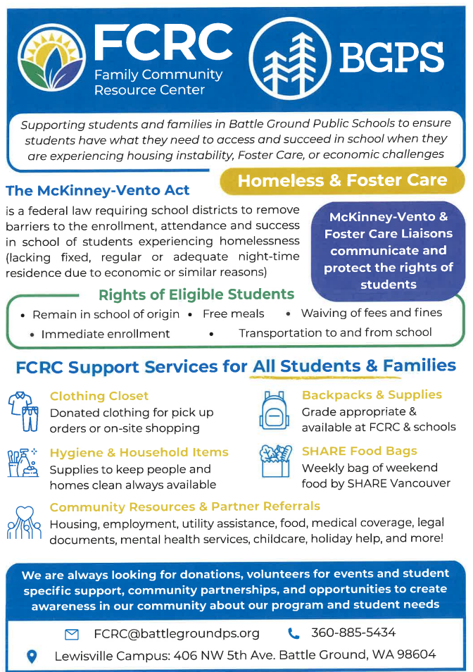Battle Ground Public Schools’ Family and Community Resource Center (FCRC) helps meet the needs of families faced with housing instability and similar economic challenges.