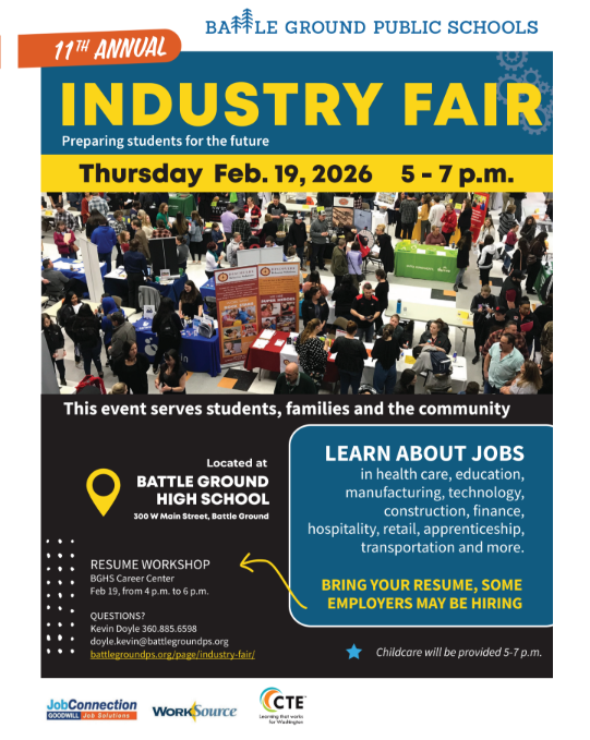 The 11th annual Battle Ground Public Schools Industry Fair will be held at Battle Ground High School on Thursday, Feb. 19, from 5-7 p.m. This event is free and open to the public. Come meet with local employers to learn about apprenticeship opportunities and employment in a variety of fields. Workers of all ages are welcome! There also will be a resume workshop in the high school’s career center from 4-6 p.m.
