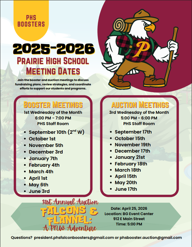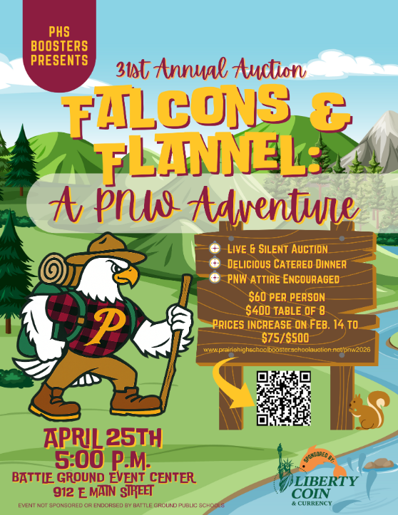 Our 31st Annual Auction ticket sales are NOW LIVE! Please see the QR code below, for access to our website with early bird pricing! Prices go up 2/14/26! Snag your tickets now so you don't miss out! https://prairiehighschoolbooster.schoolauction.net/pnw2026/homepages/show Interested in joining boosters? Want to find out more information? Want to be part of the Auction? Join us at any of our meetings to learn more and get involved! Hope to see you there! |