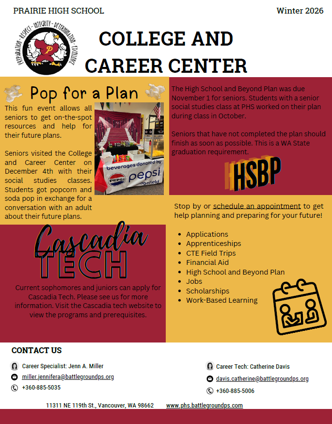 You’ll learn about Running Start at Clark College, Cascadia Tech Academy (Skills Center), career and technical education, work-based learning, College in the High School and Advanced Placement classes. Please contact your child's counselor with questions about dual credit classes. |