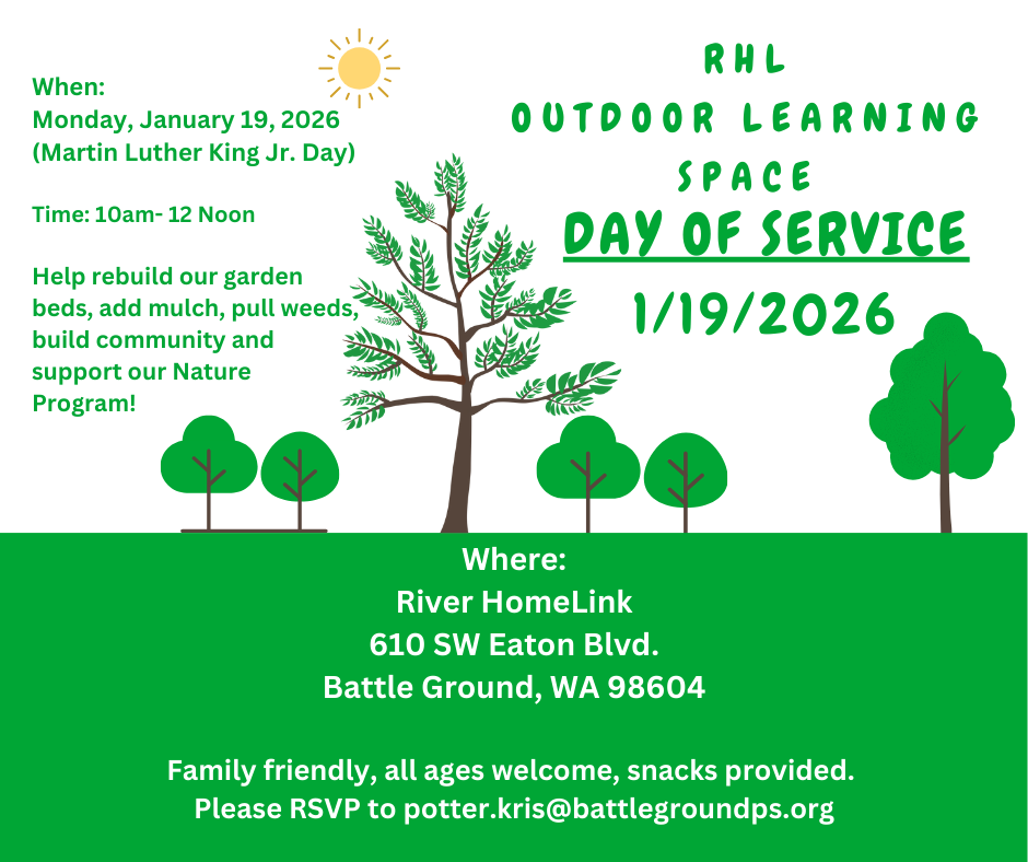 Our parking lot is shared by River HomeLink, Maple Grove Primary, and Battle Ground Virtual Academy. For safety reasons we recommend cooperation and attention to start and dismissal timing for each school are essential. To keep our students and families safe, all drivers must follow RHL’s parking lot expectations during drop-off and pick-up.