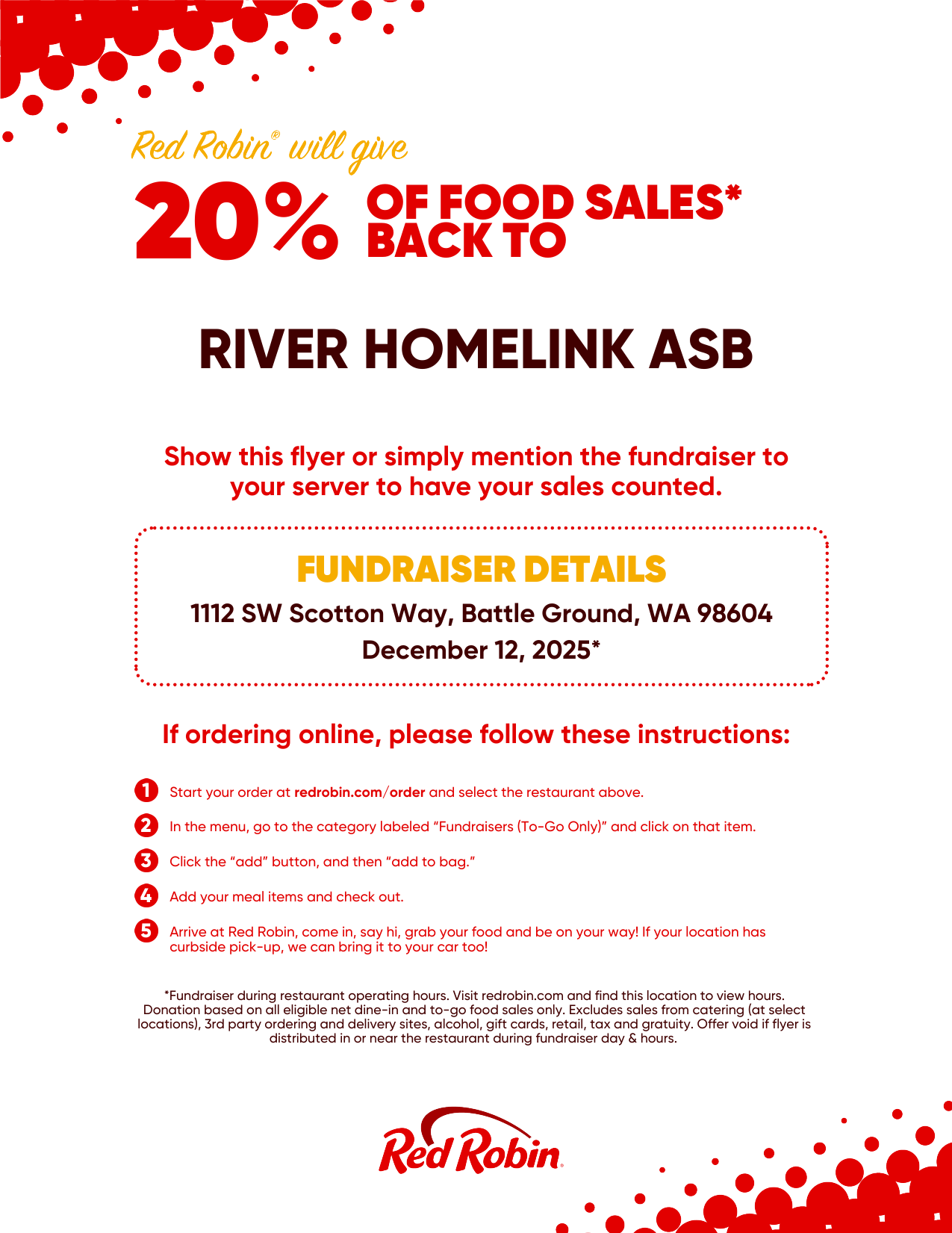 - December 12: ASB Red Robin Fundraiser